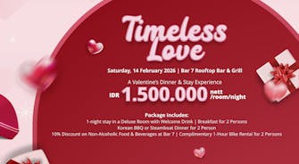 Enjoy a one-night stay in a Deluxe Room complete with a welcome drink, breakfast for two, and a choice of Korean BBQ or Steamboat Dinner for two at Bar 7 Rooftop Bar & Grill. Complement your stay with dining privileges and a complimentary one-hour bicycle rental—curated for a memorable celebration of love.